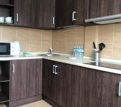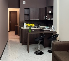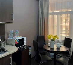 У нас был забронирован номер с балконом на 40 кв., оказалось, он ещё и 2х комнатный (кухня отдельно, не студия), что вообще прекрасно,если кому-то нужно поработать отдельно.