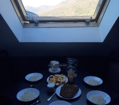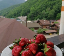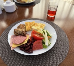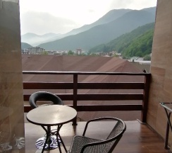 Отель удобно расположен, всё в пешей доступности, и не на проезжей части. Вид на горы просто идеальный. Завтрак достаточно разнообразный: два вида каш, варёные яйца, омлет, блинчики, пельмени, котлетки, сосиски, сырники, запеканка.