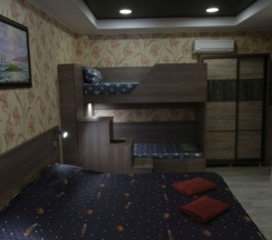 Уютный номер на четвертом этаже гостевого дома с мини-кухней, индукционной плитой, холодильником. Современный LED телевизор с более 20 цифровыми телеканалами в отличном качестве с возможностью подключения внешних носителей. Современная сплит-система. Родители могут расположится на двуспальной кровати 160*200, а ребенок на удобном кресле-кровати.