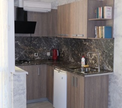Комфортабельный, однокомнатный номер-студия с балконом и кухней. Номер подойдет для семьи с двумя детьми. Родители могут расположиться на большой двуспальной кровати, а дети на двухъярусной кровати. Возможна установка дополнительного спального места. Душ, туалет в номере. Также есть холодильник, сплит-система, шкаф, тумбочки, LED ТВ с двадцатью цифровыми каналами. На окнах москитные сетки.