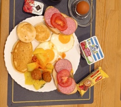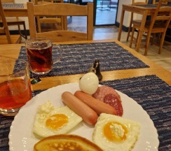 Я бронировала проживание с полупансионом, завтрак ещё окей, но лучше приходить к началу, иначе всё съедят. Никто не рассчитывает кол-во еды. Про обед/ужин я вообще молчу, еда из школьной столовки, уже подсохшая и разогретая. Есть меню, но в нём всегда отсутствует половина позиций, поэтому каждый день Вы будете есть гречку с курицей. В городе будет вкуснее и, возможно, дешевле.