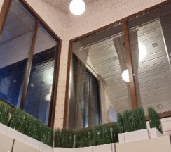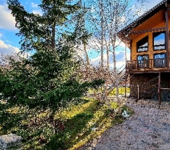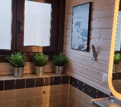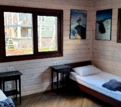 Снимали фиолетовый домик, вместил 14 человек с комфортом. Интерьер стильный с витражными окнами в общем зале, спальни тоже порадовали, ванные комнаты оснащены всем необходимым) однозначно лайк
