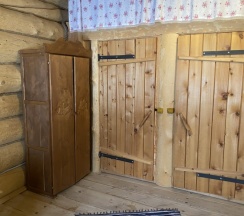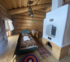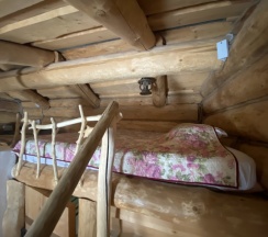 Основное спальное место - полати, матрас на печи; на печь нужно подниматься по небольшой деревянной лестнице; кровать огорожена перилами.