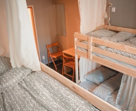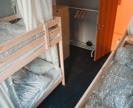 В номере 2 двухъярусные кровати с ортопедическими матрасами, шторки, бра и розетки у каждого места, что позволит Вам создать индивидуальное пространство, шкафчики, закрывающиеся на ключ. Также имеется стол, стулья, вешалка и зеркало, напольное покрытие-ламинат.