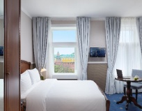 Если бы не промятые матрасы, оценка была бы твердая 5. Чистый просторный номер, большой санузел, идеальное месторасположение. Хорошие завтраки - шведский стол. Хороший выбор блюд по стандартному меню, с адекватными ценами. Приветливый персонал. Рекомендую и сам теперь буду останавливаться в нем.