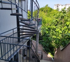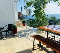 Гостевой дом находится на вершине горы (примерно 118 м над уровнем моря), есть крутые подъемы и спуски, но для нас это был очевидный плюс, ведь спорт на отдыхе никто не отменял! Сама территория гостевого дома не очень большая, но удивительно красивая, цветущие деревья, зелень, с веранды отлично видно море, для удобства поставлен большой стол со скамейками и парочка столов со стульями,. Вечерами мы там наслаждались видом на море и кушали фрукты. И раз уж я заговорила о теме еды, то приготовить покушать можно было на первом этаже, там располагается кухня, есть два холодильника, плита, раковина, посуда, стиральная машина. Совсем рядом, на открытом воздухе, находится обеденная зона. Можно покушать, посмотреть телевизор, пообщаться с соседями Wink Ночью приходят еноты и нам даже удалось увидеть одного такого нагловатого, в поиске еды. Поэтому всю еду хозяйка рекомендовала убирать со столов.
