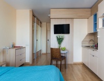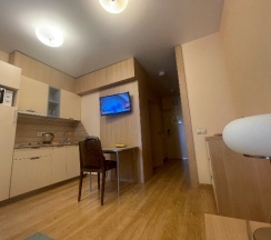 Из плюсов: да всё остальное.) Метро недалеко, есть хороший ресторан недалеко (на первом этаже гостиницы тоже есть ресторан), хорошая новая мебель, чисто, кухня симпатичная.балкон есть. В общем, хорошая гостиница.