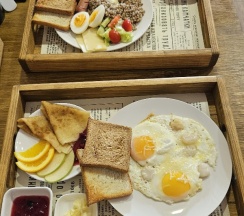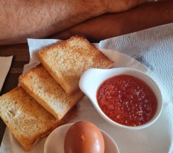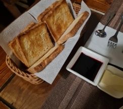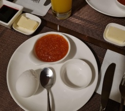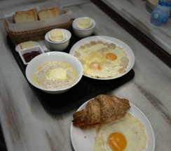 Завтраки проходят в основном здании, до него нужно пройти через улицу. Выбор из пяти вариантов — от круассана с ветчиной до яичницы с гребешками. Подаются с тостами, маслом, вареньем, напитками. Нужно заранее, с вечера, сообщать о времени и выборе. Связь с ресепшеном — через WhatsApp, что удобно.