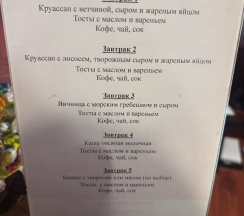 Завтраки отличные! Можно выбрать 1 из 5ти видов. Порции большие, все вкусно. Для ребенка отлично подходят каши. Кофемашина есть! Девушка повар также в течение дня может накормить пельменями и варениками, собственноручно слепленными. У нее очень вкусные сырники!