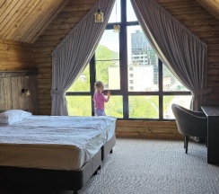 Проживали в гостинице «Начальник Камчатки» в мае, остановились на 4 ночи. Выбирая номер, долго сомневался, но в итоге решил взять отдельный домик — и не пожалел. Просторное двухэтажное размещение: на первом этаже столовая зона и санузел, на втором — большая комната с кроватью. Из окон открывается красивый вид на Петровскую сопку, Култушное озеро и здание самой гостиницы. Домики расположены за корпусом отеля — к ним ведёт лестница сбоку здания.
