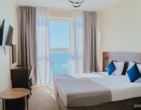 Плюсы: шикарный вид на море, окна в пол. Шум моря. Есть одноразовые предметы гигиены. Полотенца, халаты. Чайник, чай. Ж/д рядом, но нет шума от него. Удобно уехать в аэропорт на ласточке. Вежливый и быстрый администратор. Холодильник. Кафе внизу. Большой уютный номер.
