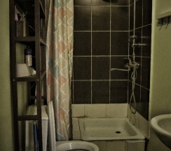 Сан узел, требуется косметический ремонт. Банально прибраться. Пыльно, очень пыльно. Дыра в стене. Душевая кабина ржавая. Раковина грязная.