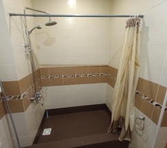 Душевая такого размера, что туда можно засунуть всех проживающих в номере в экипировке и с лыжами.