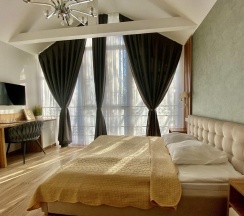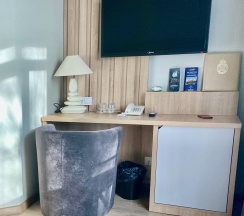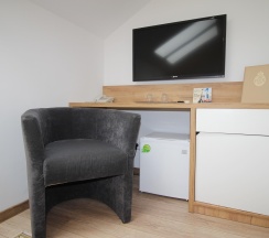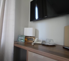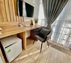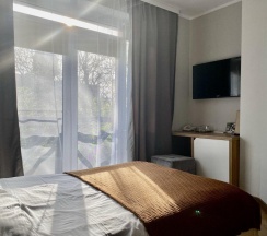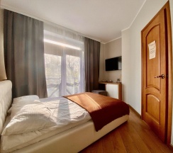 Когда приезжал в командировку, бронировал номер мини стандарт. Он хоть и небольшой, но для меня одного было вполне уютно. В номере была немаленькая кровать, плазма на стене, тумба с телефоном, и даже маленький диванчик. Интерьер очень симпатичный, успел решить не только вопросы по работе, но даже и посетить некоторые достопримечательности, благо многое было рядом.