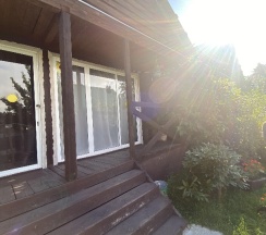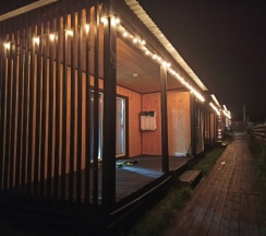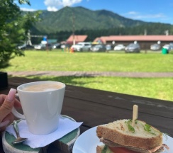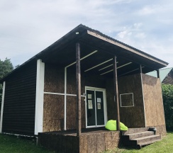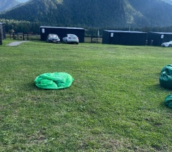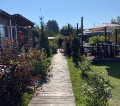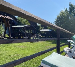 Отдыхали на базе проездом в более дальние места, двумя семьями с детьми. Жили в домиках на четверых, что стоят входами на поле, дальше всех от дороги. Сама база очень красивая и ухоженная: газон, цветы, кусты, дорожки - выглядит супер) Для детей миллион развлечений! С ними играет аниматор, есть два стационарных батута и один надувной, сетка для волейбола, столик для тенниса, настолки и, самое главное, бассейн! Чистый и тёплый (купались даже в дождик). Домики, где мы жили, такие мини-квартирки: зона прихожей, кухонька зоной, зона гостиной с диваном (раскладным, где спали дети) и телевизором (не включали, не знаю, что показывает)), спальня с кроватью и шкафом, ванная комната с душевой кабиной. Было непривычно тесно, но для короткого пребывания вполне уютно) Всё чистое, новое, стильное, красивое! Посуда, постельное бельё, полотенца и душевые принадлежности. Крылечко просторное, крытое с деревянными креслами и столиком с видом на поле, где бегают коровы и кони (дети от такого в восторге)). Мангал напротив каждого номера. Калитка в поле, пройдя через которое, можно попасть на берег реки (через другую базу пускают). Администратор Елена очень позитивная и отзывчивая, спасибо за Вашу работу!
