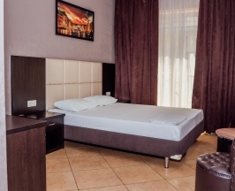 Светлые номера, с одной большой кроватью, шкафом для одежды, холодильником и чайной станцией.
