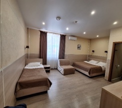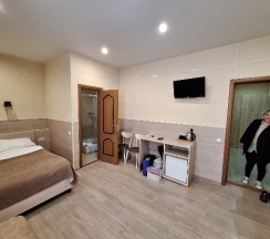 Небольшая гостиница 2 этажа, номер чистый, полотенца и банный халат в наличии, также в номере есть чайник, холодильник, телевизор (только пульта не было) . Душевая, туалет все в номере. Делали бронь, её быстро подтвердили, также на ресепшене быстро оформили и заселили. Окна выходят во двор, ночью тишина. В номере не хватало тапочек и зубной щётки с пастой, одноразовой. А так в целом нам всё понравилось, будем ещё останавливаться