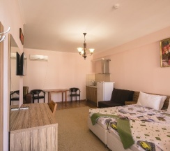 Всем привет, только что съехали от туда, все прекрасно, есть бассейн, который чиститься и дезинфецируется ежедневно. В номере были кружки и тарелки, на территории была кухня, на которой спокойно можно приготовить себе еду, мы пользовались там микроволновкой. Очень порадовало, что это единственное место было, где за нормальную стоимость ты можешь отдохнуть, ещё и так близко к морю и олимпийской деревне. В номер каждый день приходила уборщица, убирала мусор. Также там были полотенца и гель для душа. Около отеля есть хорошие кафе, в которых можно вкусно и недорого поесть. В общем спасибо за хороший и комфортный отдых!