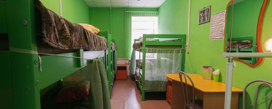 В восьмиместном общем номере: четыре двух-ярусные кровати, ящики с ключами - для хранения вещей, тумбочки, стол, стулья, вешалка, большое зеркало, светильник, вентилятор.