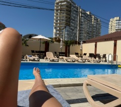 Чудесный отель! Отдыхали с 17 по 24 июня. Чистый и ухоженный номер ( кондиционер, ванная комната, телевизор, холодильник). Проживали на первом этаже с видом на бассейн, очень удобно наблюдать за ребёнком. Бассейн ухоженный с тёплой водой, купались и дети и взрослые. Завтрак разнообразный: каши, хлопья (любимое блюдо ребенка), колбасы, сыры, овощи и фрукты, свежий творог, кофе очень вкусный, свежеиспеченные блины и оладьи. Рядом магазины Магнит, Пятёрочка, небольшой рыночек, где всегда свежие фрукты и овощи ( особенно торговец Лева и продавец рыбы Вартан), шашлык, мангал. До моря идти около 15 минут, но нам было комфортно, сжигали калории после завтрака)