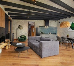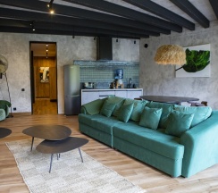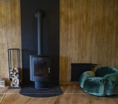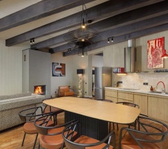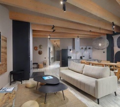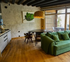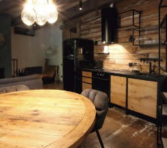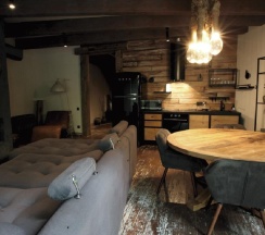 В центре коттеджа — просторная гостиная с мягким диваном, камином, кухней и большим обеденным столом на 8 персон.