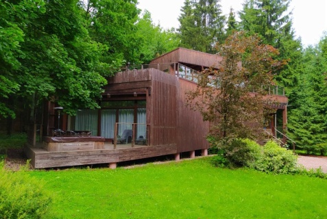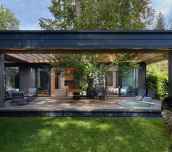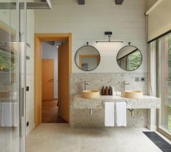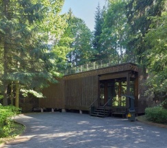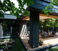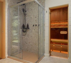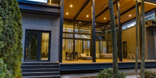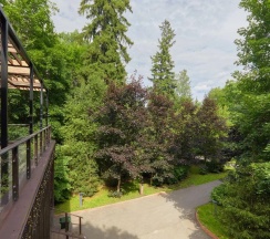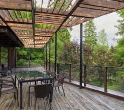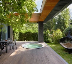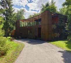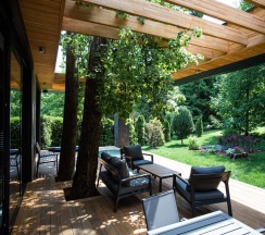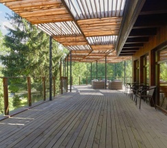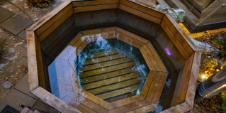Банный комплекс находится в отдельно стоящем здании в лесу площадью 350 квадратных метров. Через панорамные окна открывается умиротворяющий вид, а зимой с террасы можно выйти прямо на снег.