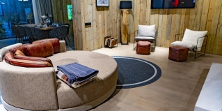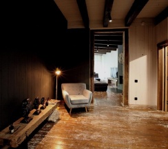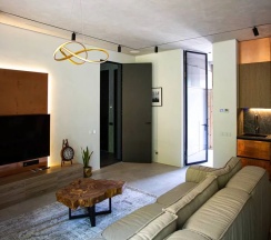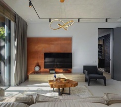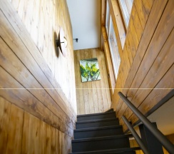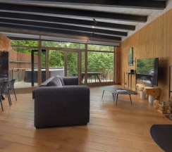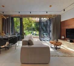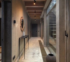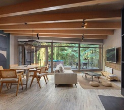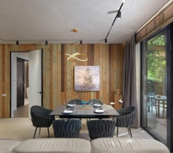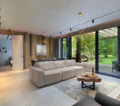 В интерьере коттеджа преобладает дерево и натуральные материалы. Панорамные окна открывают вид на зелёную территорию клуба и обеспечивают натуральный солнечный свет внутри.