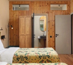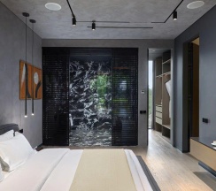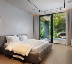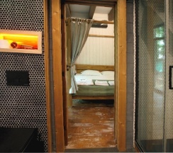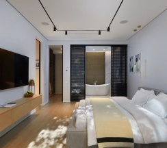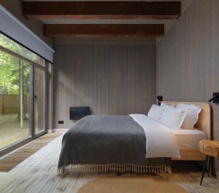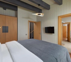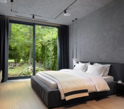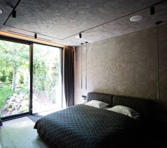 В коттедже расположены две спальни с двуспальными кроватями, в черной и белой цветовой гамме. Белая спальня совмещена с просторным санузлом и роскошной ванной. Чёрная спальня оборудована душевой.