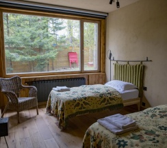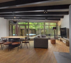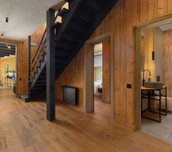 В коттедже расположены 4 спальни с двуспальными кроватями, совмещенными с современными ванными комнатами. На первом этаже — просторная гостиная с двуспальным диваном, дровяным камином и большим обеденным столом на 8 персон.