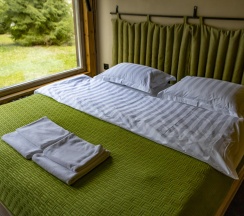 В коттедже расположены 2 спальни с двуспальными кроватями и мягкими матрацами для полноценного расслабления и комфортного сна.