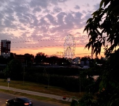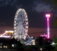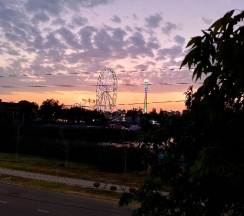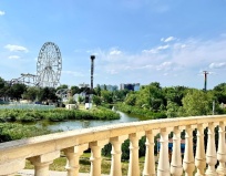 На 4 этаже есть общий большой балкон с диваном и парой столиков, вид с него хороший, на парк аттракцион, одно чёртово колесо что стоит, светится в темноте всеми цветами радуги.
