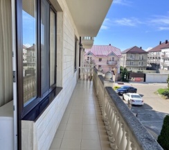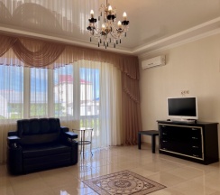 Отдыхали с тремя детьми в июле. Гостевой дом шикарный: чисто, светло, красиво, уютно. Приятный ремонт, у греческом стиле. Номер прекрасный: хорошая кровать с удобным матрасом, диван и кресло раскладываются(Детям в самый раз). На этаже гладильная доска с утюгом, электрочайник. В номере Есть кондиционер, балкон. Есть также на цокольном этаже небольшой тренажерный зал, которым мы с радостью воспользовались. Есть ещё обеденная зона на цокольном этаже с СВЧ-печью и столовыми приборами. Готовить самим у них нельзя на кухне. Детская площадка перед отелем есть и небольшой бассейн. Для детей самое то! Через дорогу изумительный шашлык! В отель Аниматоры для детей 2 раза в неделю приходят! Само Место тихое. Для отдыха семейного отличное место! Шумоизоляция в номерах отличная! К морю ездили на машине, на косу. Там меньше народа и вода чище. Поэтому пешую удаленность от центрального пляжа не знаю. Рядом магазины и столовые. Отель однозначно рекомендую. Администратор и персонал вежливые,отзывчивые, спокойные. Отдохнули мы прекрасно!