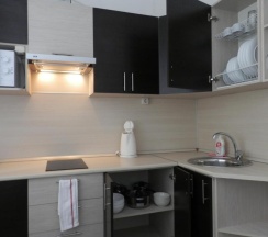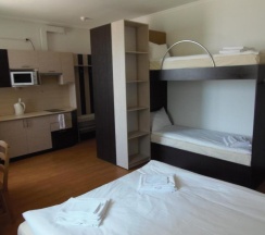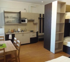 Удобства комнаты: Кондиционер , Отопление , Паркетный пол , Ванная комната , Туалет , Душ , Фен , Телефон , Радио , Спутниковые каналы , Телевизор с большим плоским экраном , Холодильник , Микроволновая печь , Кухня , Обеденный уголок , Электрический чайник , Кухонные принадлежности , Будильник , Гриль , Электрическая плита со стекло-керамической варочной поверхностью , Кухонная вытяжка , Посуда , Столовые приборы , Постельное белье , Банные принадлежности , WiFi .