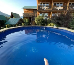 Ночевали одну ночь в конце сентября. Трёхместный номер, останавливались вдвоем. Тихо, уютно, чисто. Есть баня, мы не пользовались. В номере есть обогреватель, душевая кабина, унитаз, стол стулья, чайник, чашки. Кровать удобная, белье чистое. Есть подход к реке. Песочек, видимо привозной. Есть бассейн, понятно, что в конце сентября был пустой. Думаю, что летом тут вообще хорошо.