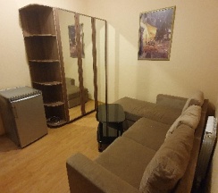 В комнате кондиционер и большой телевизор, есть 2 тумбочки, шкаф, столик, комод, холодильник. Даже маленький пуфик у входа стоял)