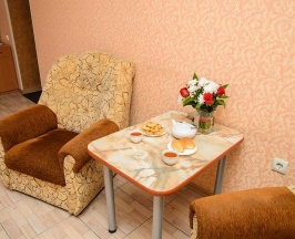 В комнате: двуспальная кровать, мягкая мебель, журнальный столик, санузел с душем, телевизор, кондиционер, фен, посуду, чайник, холодильник, бесплатный Wi-Fi.