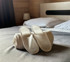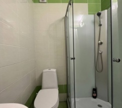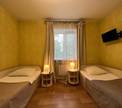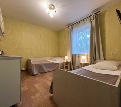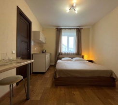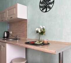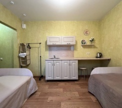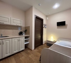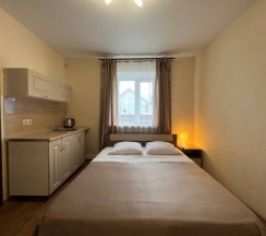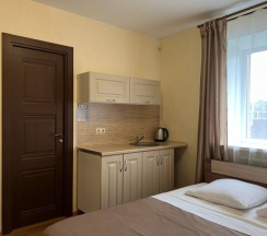 Номер стандарт, 12м2, оснащен мини-кухней: плита, чайник, вся необходимая посуда. Приятный бонус в виде чая и конфет. Собственная ванная комната с душем. Комплект полотенец. Телевизор и бесплатный wi-fi. Услуги по доставки еды, трансферу.