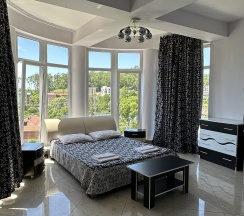 Номера «люкс» — это пространство без границ — студия размером около 50 кв. м. В номере имеется кровать king-size и большой комфортабельный диван, категория «ежедневный сон» с отличным матрасом. Номер вмещает до 6 человек. Возможно установка одного дополнительного места.