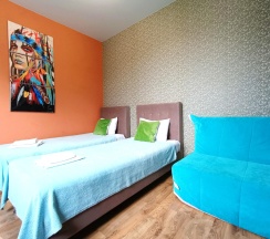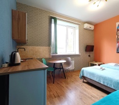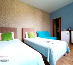 Двухместный номе с двумя односпальными кроватями и диваном-кроватью. В комнате предоставлена мини-кухня и собственный санузел с душевой.