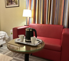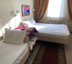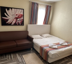 В номере две удобные односпальные кровати 90*205 или одна широкая двуспальная кровать 180*205 на Ваш выбор. Здесь у вас будет холодильник, письменный стол и самая выгодная цена во Внуково!