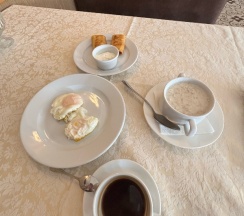 Не понравилось: В некоторых местах видно, что ремонт был давно и есть некоторые непродуманные детали. Например между полом и входной дверью большой зазор и дует. А так же это влияет на слышимость. На завтрак принесли прекрасный омлет и кофе, но размороженные покупные блинчики вкусными назвать сложно.