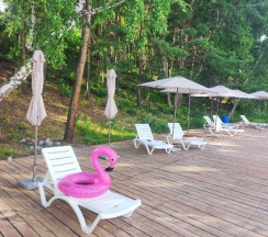 Шикарная территория, на которой, разрабатываются новые "локации". Есть выход на пирс, шезлонги, зонтики. Везде чистота, порядок и чистейший воздух.