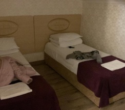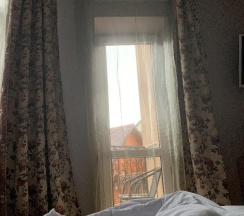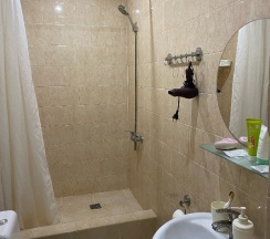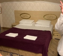 Дверь в туалетную комнату закрывалась только изнутри, снаружи не держалась, пришлось мастерить закладку. Сантехника "уставшая", крышка унитаза расшатана, на кранах трещинки, но все работает. Кровать большая, диван удобный, белье чистое, меняли за неделю 1 раз. Полотенца норм. Халатов и тапочек нет, зубных щёток и пасты нет, шампунь-гель не пополняют.