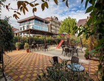 Нам очень понравился отель, у нас был двухэтажный отдельный коттедж. Он великолепен, никто никому не мешает. В домике было вообще всё, что необходимо для жизни. До Олимпийского парка 5 минут. До моря каждые пол часа возит автобус, что очень удобно. Наискосок была столовая, дороговато, но довольно съедобно. На территории детская площадка. Спасибо большое!
