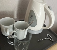 Номер с кухней для семьи с ребёнком тесноват, хотя возможность приготовить, что нужно, искупает этот недостаток. Розеток хватает. Стиральная машина, холодильник и микроволновка работают, плитка индукционная, с одним жарочным местом, управление удобное. Посуды минимальный набор, в принципе хватает, но кастрюлю можно было бы выдать и вторую)