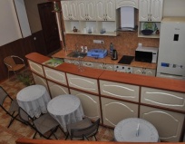 В гостинице есть кухня--холодильник, чайник, кулер, плита, микроволновка, посуда.
