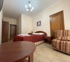 Однокомнатный номер с балконом на 1-4 этажах витражные окна во двор или на горы, общей площадью 17-21 м2, в котором расположены два раздельных бокс-спринга 200х80 или один двухместный 200х160 и дополнительное спальное место раскладное кресло 200х80
