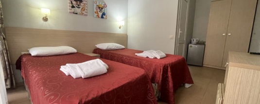 Однокомнатный номер на 1 этаже с отдельным входом через террасу, общей площадью 15 м2, в котором расположены два раздельных бокс-спринга 200х80 или один двухместный 200х160.