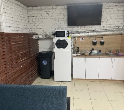 Есть просторная кухня для всех посетителей с микроволновкой и чайником, комната для глажки, комната отдыха с книгами и настолками, во дворе тоже есть зона отдыха – лавочка-качели и др.
