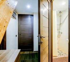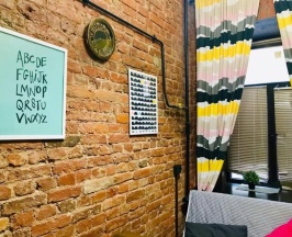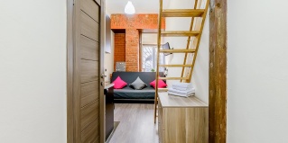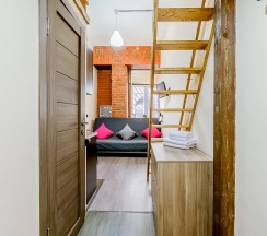 Двухуровневая студия оборудована всем необходимым для проживания. В апартаментах односпальное место на втором уровне и диван-кровать двуспальный на первом уровне. В студии: собственный душ и туалет, мини-кухня, холодильник, микроволновая печь, электрический чайник, посуда, ТВ и WI-FI, постельное белье и полотенца, фен. Стиральная машина, утюг и гладильные принадлежности в общем доступе.